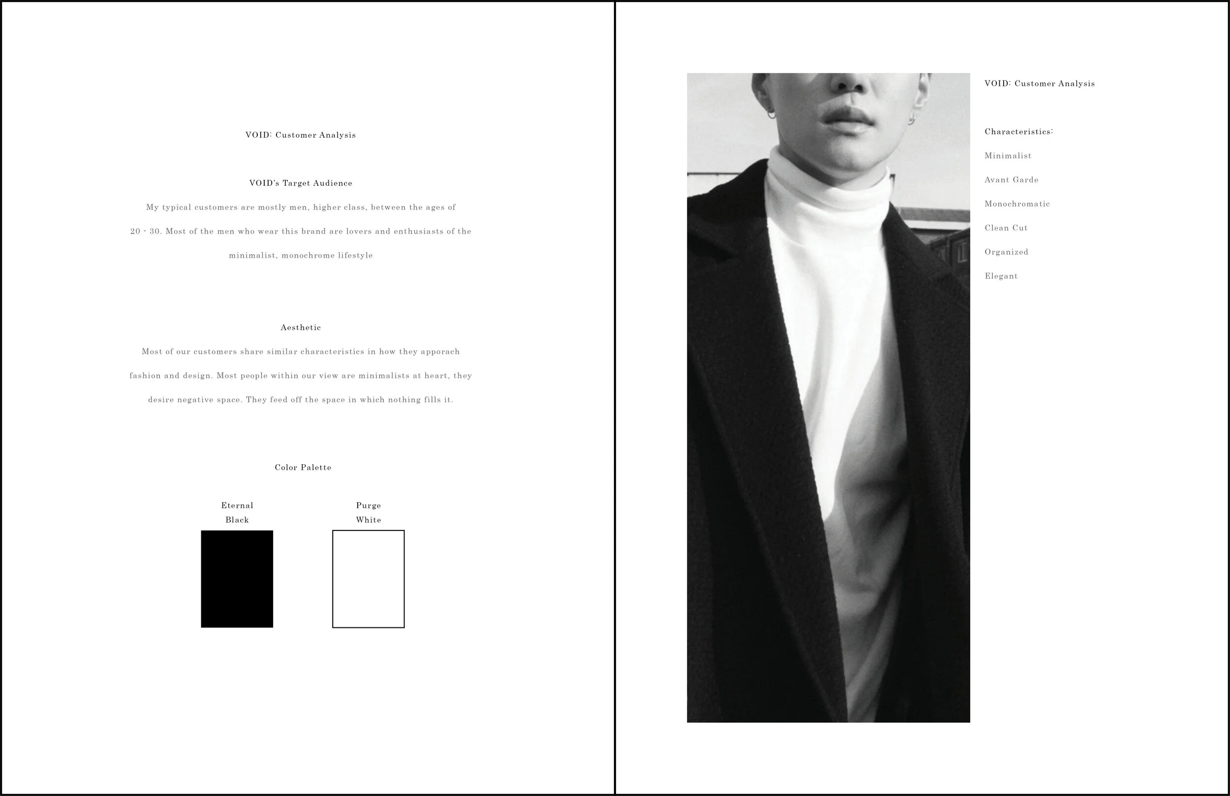 In terms of high fashion, this treatment of black being elegant as opposed to the former comes from the minimalist aspect that the color black is accompanied with. I wanted to explore these aspects of minimalism of all black clothing from a branding perspective. What would it look like? What mood does it give off? How it can it still show individuality while being both minimalistic and only using the color black.